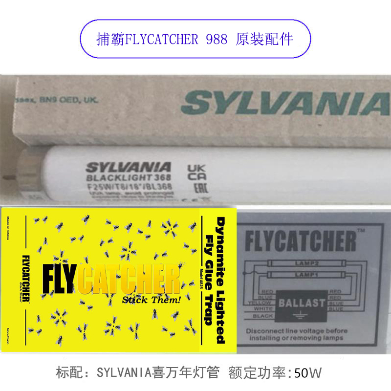 捕霸988灭蝇灯工作原理:选用德国进口SYLVANIA喜万年黑光灯管,通过特殊光频吸引苍蝇等飞虫飞入灯盒,被U型卡槽内预置的粘蝇板粘住, 达到杀灭飞虫的目的。标配百年品牌灯管SYLVANIA BLACKLIGHT 368,特殊光频稳定,有效寿命强,飞虫诱捕功能效果好铝合金材料外壳设计和防火阻燃设计,耐潮湿,酸碱环境环境,是食品工厂及各类需要大型空间飞虫控制产品客户的良好选择。